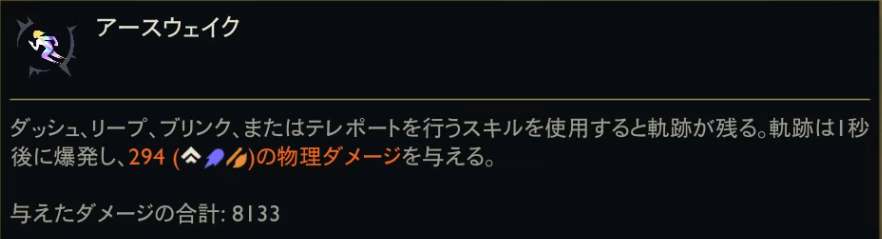 効果はかなり分かりやすく、ダッシュ・リープ・ブリンク・テレポート系のスキルを使うと軌跡が残り、1秒後に爆発して物理ダメージを与えるタイプです。