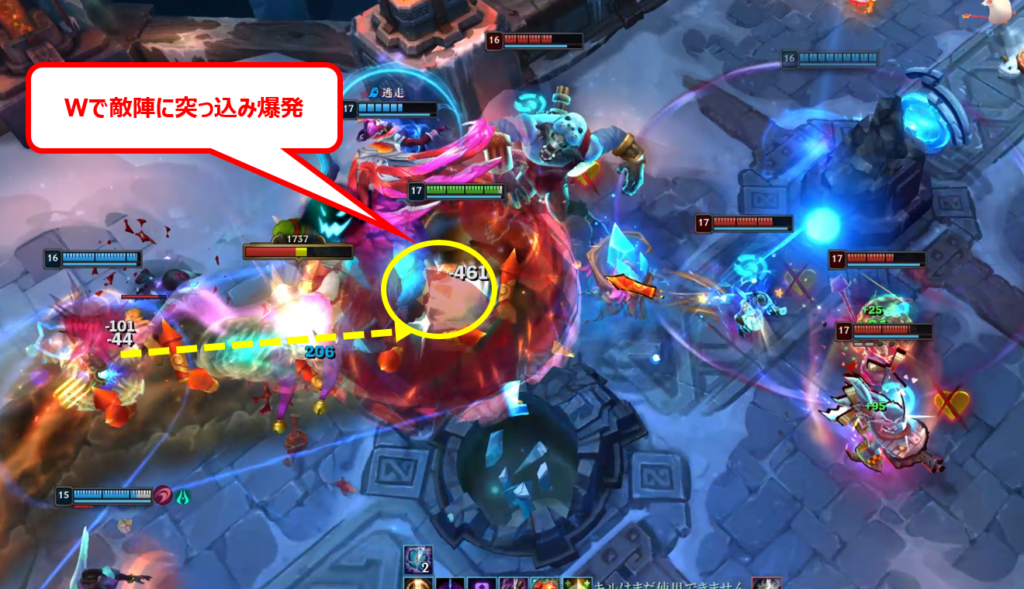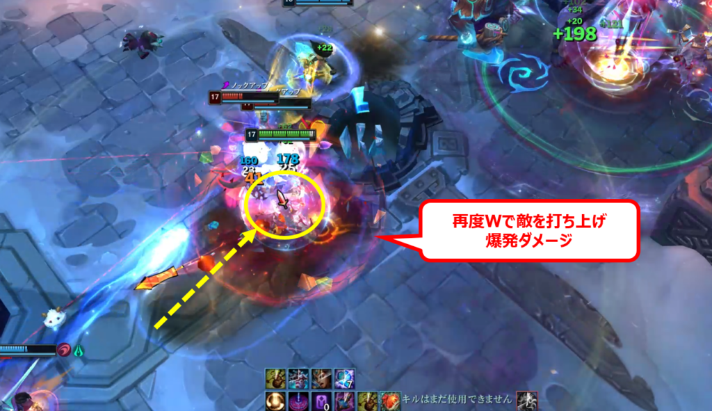 すでにWのクールダウンが上がっているので、Wで敵を打ち上げ爆発ダメージ