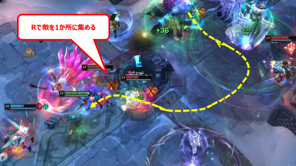 まず結論:ラカンはWで敵陣に飛び込んで、アースクエイクで爆発、敵が飛びつこうとした瞬間にEで味方に移動し、さらに爆発、これが何度も行うことで、サポートチャンピオンなのに、脅威的なダメージが出せます。