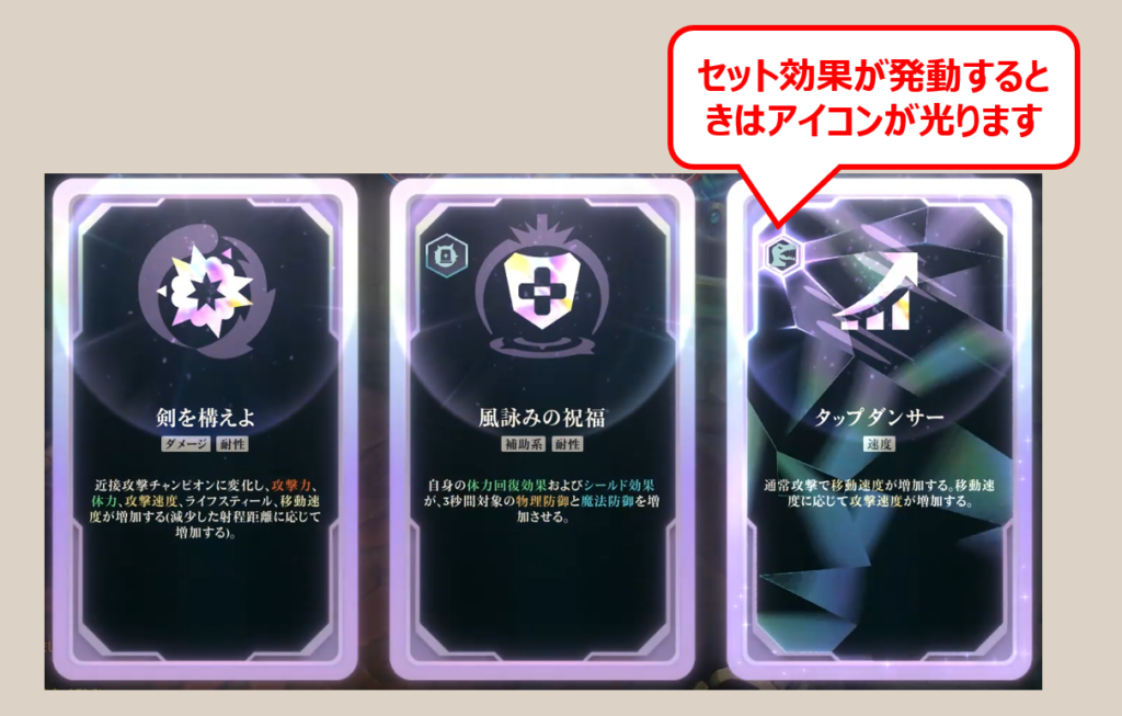 セット効果を発動するときは、アイコンが光るので、基本は、取得が良いです。