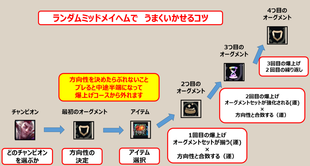 一言でいうと、ランダムミッドのテンポ感はそのままに、途中で強烈なパワースパイク(ぶっ壊れ強化)を何度も作れるARAM。運と発想とシナジーで、いつものARAMより「別ゲー」になります。