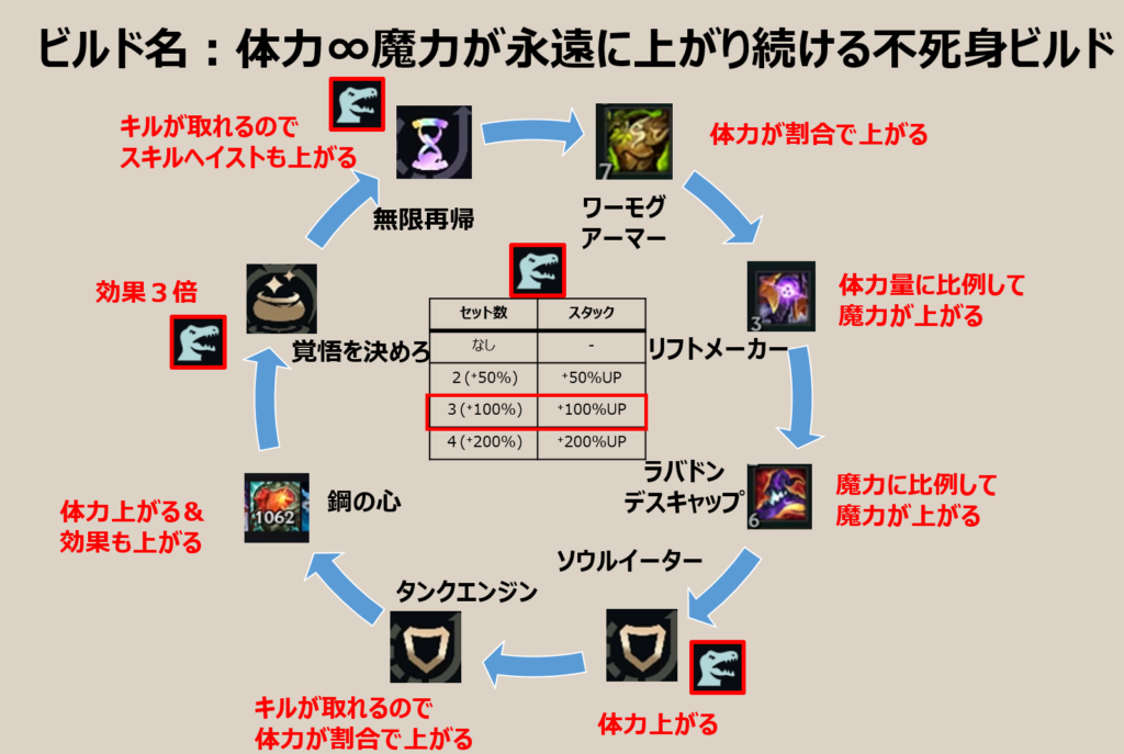 ![]() | タンクエンジン | キル・アシストで体力&サイズ5% | 単独は微妙、セット効果スタックサウルスレックスがついた瞬間に最強に化ける。魔力ならリフトメーカー、攻撃力なら覇王のブラッドメイルで無限スケールが可能 |