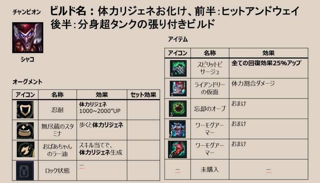 シャコ:体力リジェネお化け、前半:ヒットアンドウェイ 後半:分身超タンクの張り付きビルド(26年3月21日記)