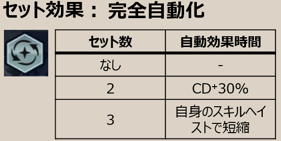 ![]() | 量子演算 | 30秒ごとに自動範囲斬り+外側80%スロウ。回復する | 30秒縛りがきつい。。が、完全自動化のセット効果を活かせる場合は、話が変わってきそうではある。(2セットで21秒に短縮、3セットで、自身のスキルヘイストに変わる、3セットが揃ったことはない。。) |