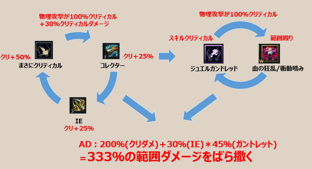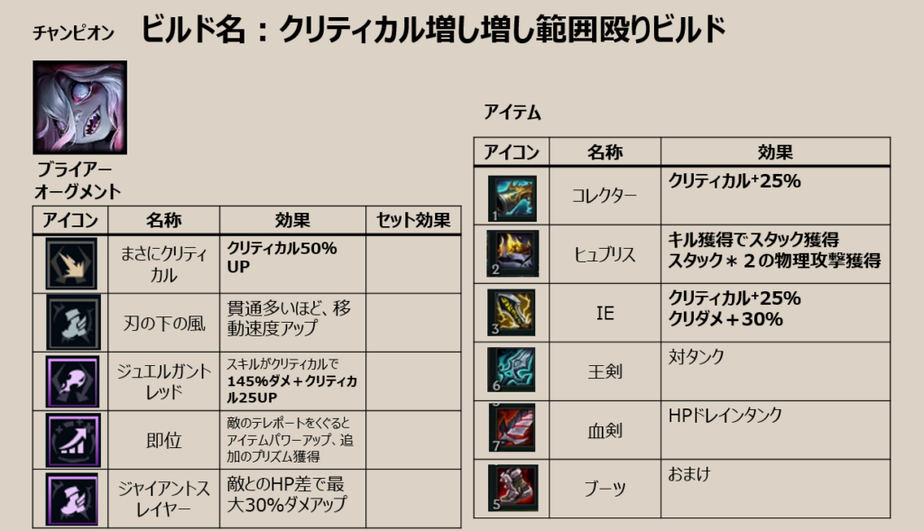 ![]() | クリティカルの律動 | クリティカル率が25%増加する。通常攻撃のクリティカル時に攻撃速度が6%増加するスタックを獲得する。(MAX10スタック=60%) | 殴り続けられたら強いが、序盤はクリティカル率が低いので、効果が出てくるのは、中盤以降なのでAティア |