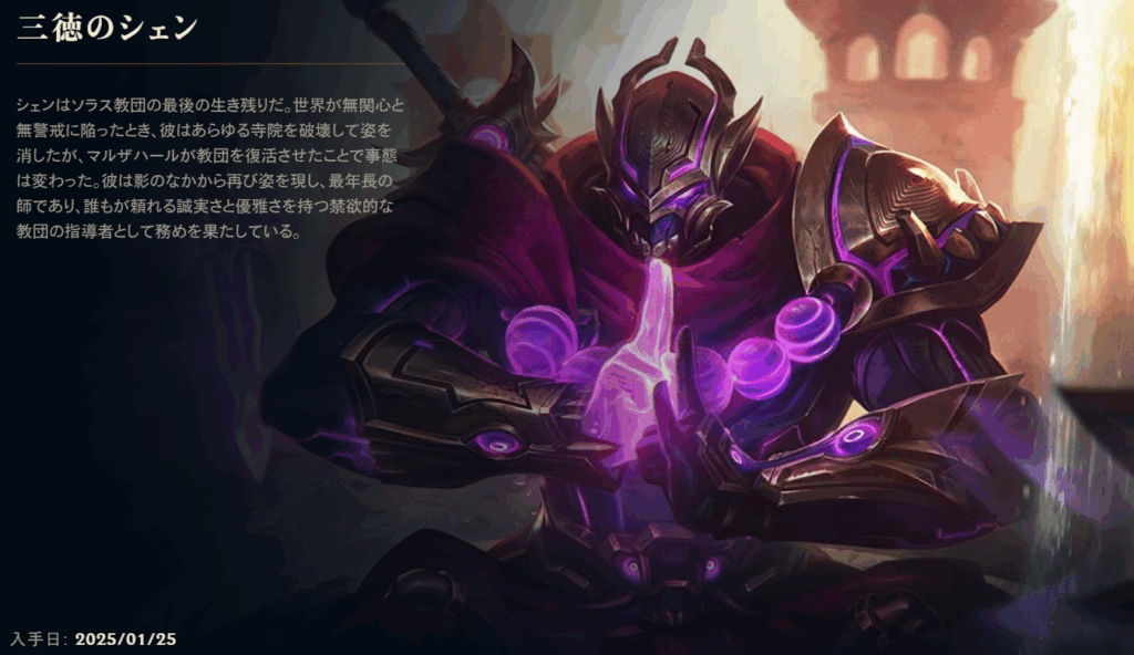 あとは、右上にこのアイコンがついているものはレガシースキンといって、ショップには並ばないので、チャンピオンのスキンコンプを目指している方は購入した方がよいです!